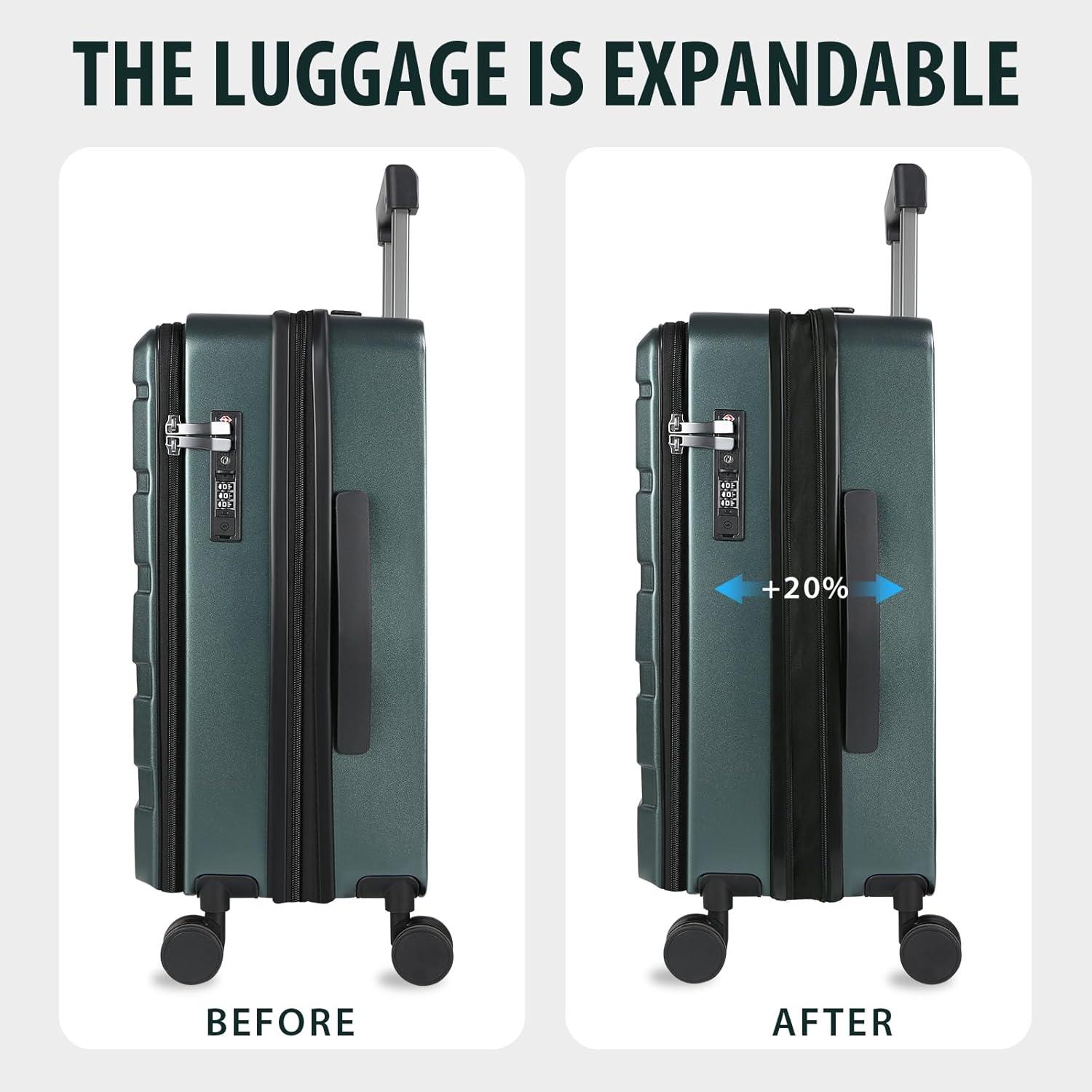 KROSER Carry On Luggage with Spinner Wheels & Built-in TSA Lock, Expandable Top Loading Hard Shell Suitcase Large Capacity Durable Rolling Luggage with USB Port, Carry-On 20-Inch, Dark Green(Light Blue)