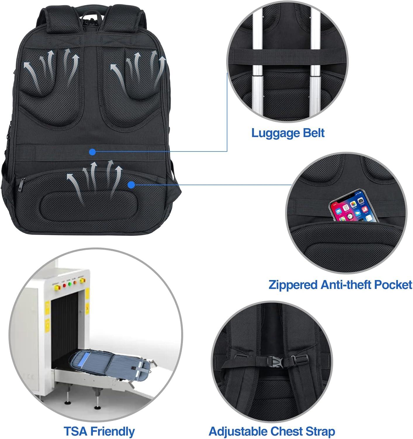 FUNCTIONAL & SAFETY】:A well-knitted “ luggage strap” is quite convenient for you to fix the backpack on the trolley of your luggage, making your journey and travelling more convenient wherever you go. Design of an air-flow back padding system and a secret pocket ensures great comfort and safety in your journey. RFID Pockets with Identity protection function protects date encoded on most IDs, credit cards and passport