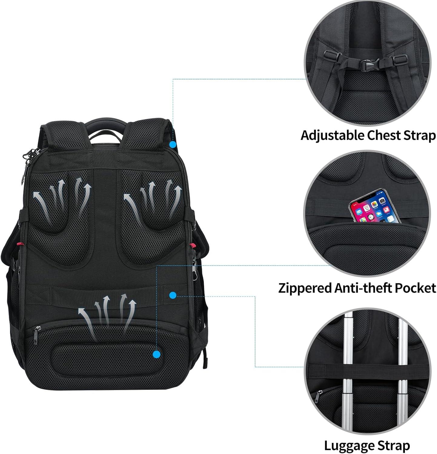 【MULTI-COMPARTMENT】: Our large travel backpack with separated compartments and pockets which can provide roomy space for your computer, iPad, power bank, A4 files, wallet, cards, clothes and more your items. Functional front pocket with waterproof zipper. Side zippered pockets and mesh pockets can hold your umbrella, water bottle, small accessories etc. A hard shell zone is designed on the top which is convenient and safe for you to put your sunglass, cell phone etc