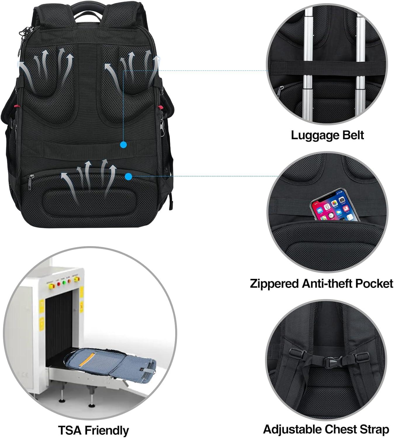 MULTI-FUNCTIONAL COMPARTMENT: Our large travel backpack with separated compartments and pockets which can provide roomy space for your computer, iPad, power bank, A4 files, wallet, cards, clothes and more your items. A zippered pocket and a mesh one at each side can hold your umbrella, water bottle, etc. A sunglass hard shell zone is designed on the top which is convenient and safe for you to put your sunglass, cell phone etc